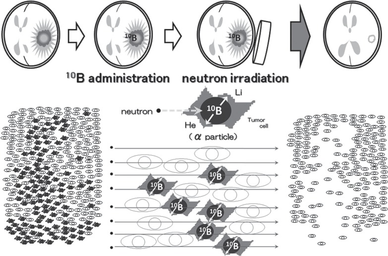 BNCT的原则体现在图1。在这个图中,大脑中的恶性神经胶质瘤是假定的目标。这种肿瘤的一个特点是它会浸润周围的正常大脑。因此,应注意肿瘤细胞选择性地积累硼-10原子而不是正常细胞。这种选择性积累是由含硼-10的化合物本身。之后10含硼化合物积聚在肿瘤细胞中,用无害的低能热中子照射肿瘤细胞。在此过程中,没有必要将中子照射专门对准肿瘤细胞。高LET粒子只会破坏含硼-10细胞并保存正常的周围细胞,如图1。